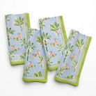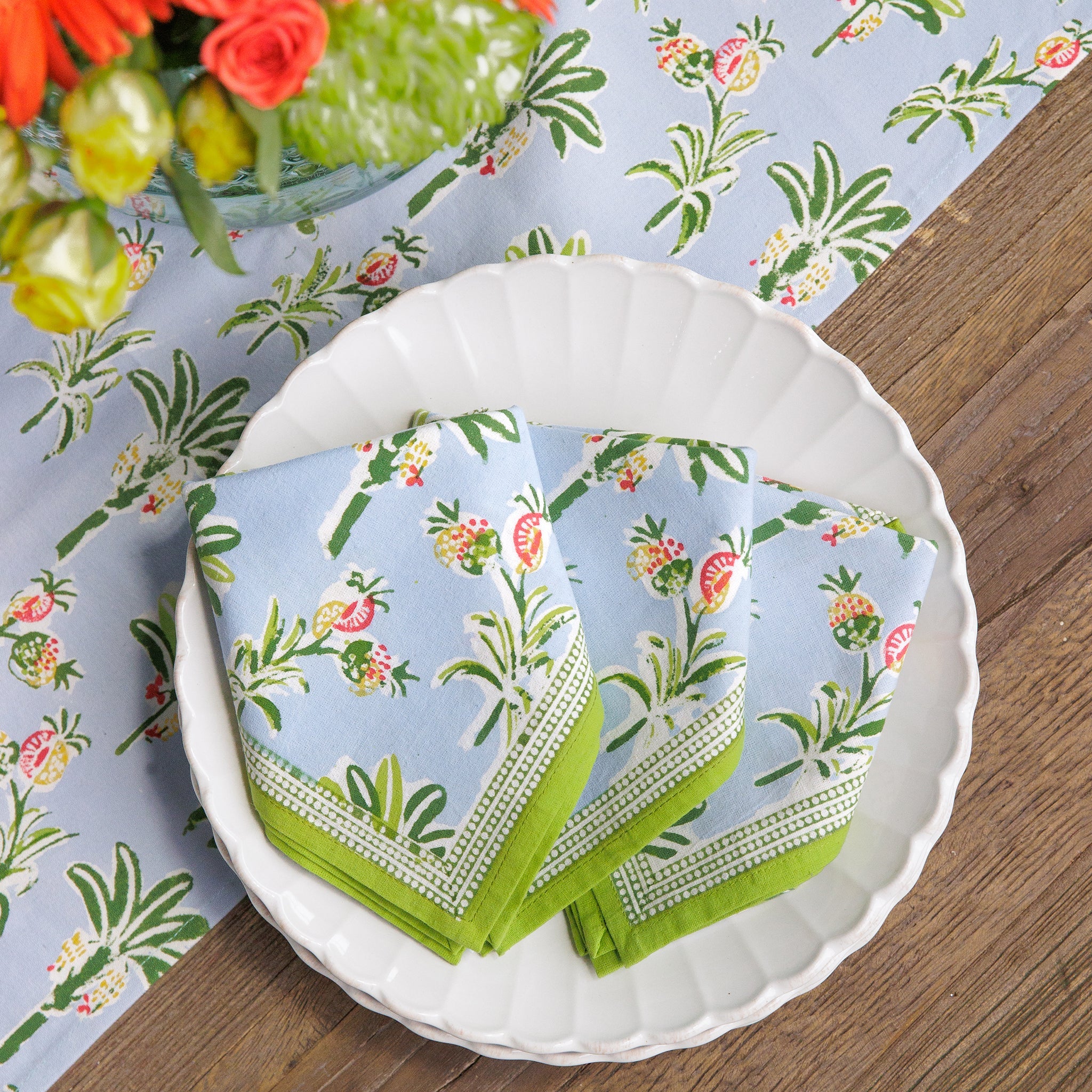 Elevate your everyday dining with the vibrant charm of the Palms & Pineapples Napkin Set by Pomegranate. Inspired by the breezy beauty of coastal escapes, these cotton napkins feature a lively mix of tropical palm fronds and golden pineapples in soft hues of light blue and green. Each piece is hand block printed by skilled artisans in India, a process that brings subtle variations and a uniquely personal touch to every napkin.