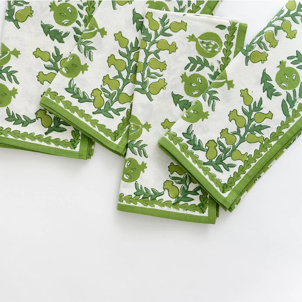 The name "Pom Bells" refers to the joyful little pomegranate buds that resemble tiny bells, captured here in a stylized bamboo-inspired motif. The design pays homage to ancient Turkish wall hangings and traditional hand-appliqué repeats, fusing heritage with contemporary appeal. Each napkin is hand block printed by skilled artisans in India using centuries-old techniques, resulting in subtle variations that celebrate the beauty of handmade craftsmanship.