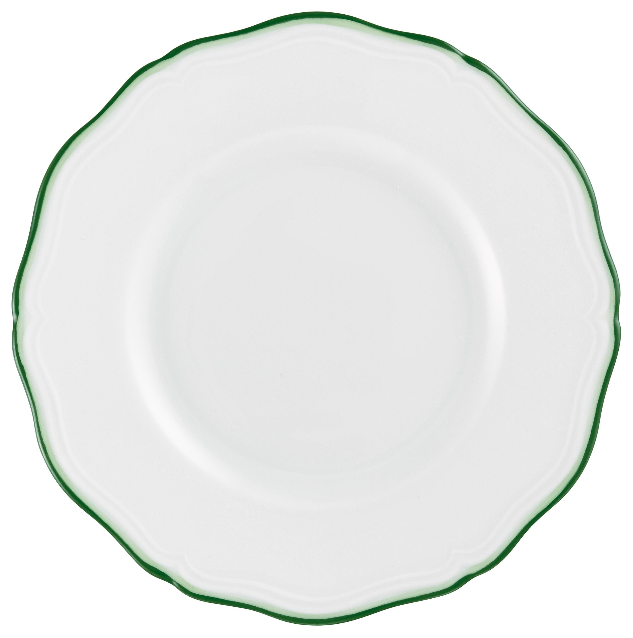 Featuring a hand-painted double filet in two delicate shades of green along its scalloped edge, the design is a testament to Raynaud's artistry. The updated smooth scalloped shape offers a contemporary touch, replacing the iconic Villandry Green's embossed wicker texturing.