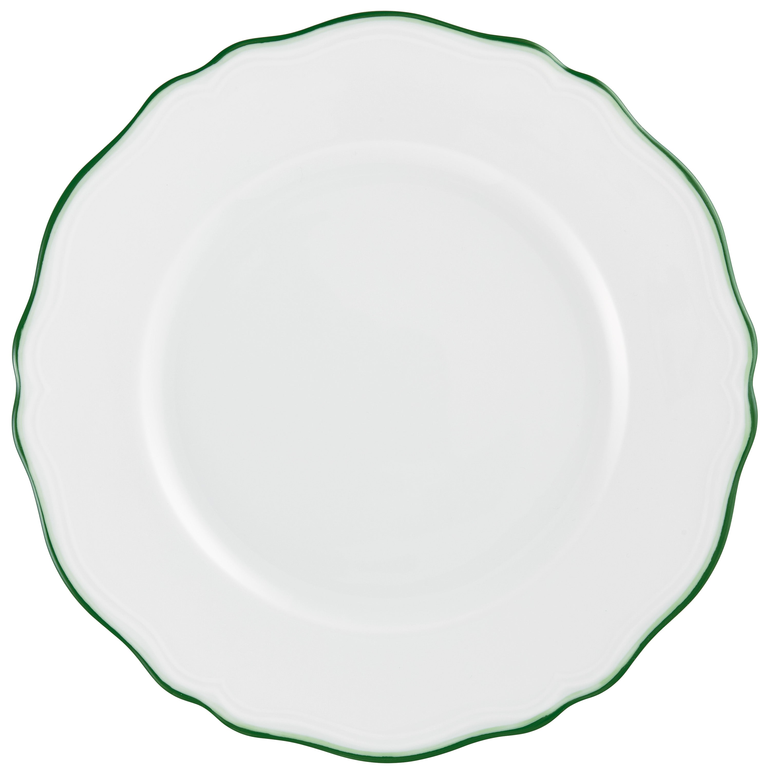 The Raynaud Touraine Filet Green Dinner Plate is a stunning example of French porcelain craftsmanship, originating from the prestigious Limoges region. With a diameter of 10.6 inches, this plate is defined by its smooth scalloped shape, adorned with a meticulously hand-painted double filet in two shades of green. The design offers a modern take on tradition, replacing the embossed wicker texture of the classic Villandry Green collection with a refined, updated silhouette.