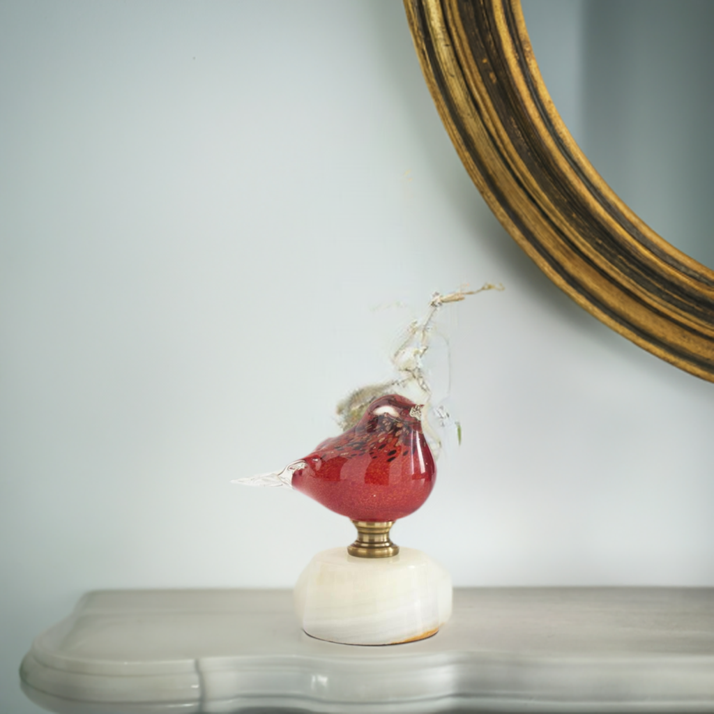 Elevate your décor with the stunning Red Glass Bird on White Marble Base. Crafted with precision, this exquisite piece adds a touch of elegance and charm to any space. The vibrant red glass bird delicately perches upon a sleek white marble base, creating a captivating focal point. Standing at 6.25" inches tall, a smaller it's the perfect size to adorn your shelf, mantel, or tabletop. Enhance your home or office with this timeless work of art, blending sophistication with nature-inspired beauty.