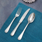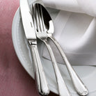 This wonderful Sambonet flatware is called Ruban Croisé. It is produced using the finest stainless steel creating a style that is best described as formal and elegant. The most prominent color of this item is polished steel colored. The 5 pcs place setting (solid handle knife) is sold as a set of 5. Please read the product description for further information regarding the contents of the set. Dishwasher safe - This Item is dishwasher safe. Please pay particular attention to the instructions of the dishwasher and detergent manufacturers on the suitability of their products. Refined stainless steel with a mirror-like sheen adds to the exquisite craftsmanship and intricate design of this 5 pc place setting. Each surface is meticulously polished with a blend of additives and various brushes to give it a flawless, high-gloss finish. The resulting reflections add a touch of opulence to the piece, making it truly luxurious. The monobloc knife is expertly crafted from a single piece of steel, eliminating any gaps between handle and blade and providing a sturdy, substantial feel when held.