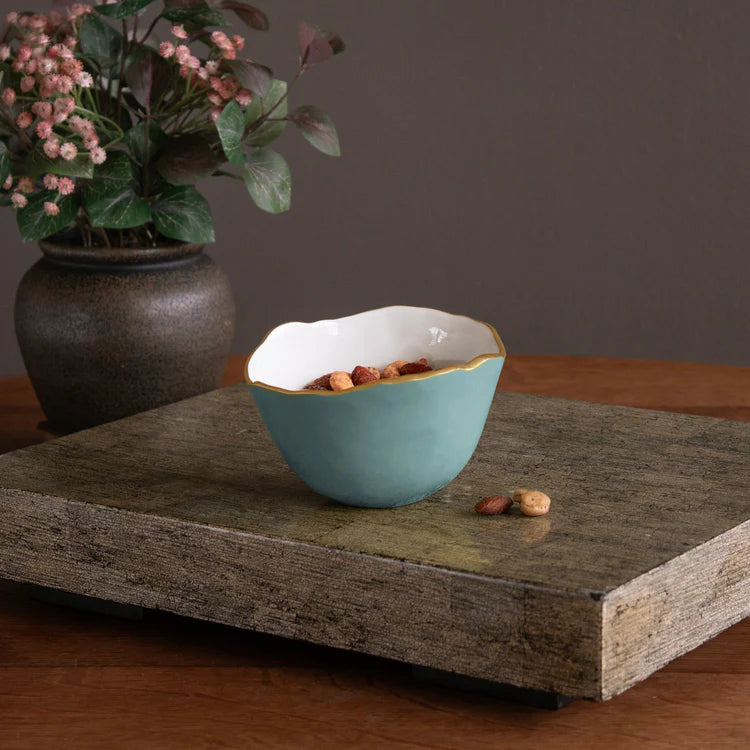 Experience the latest innovations in handmade offerings from Beatriz Ball's multicolored ENCANTO Collection. Featuring vibrant enameled colors and gold-tone details, the collection includes bowls, trays, platters, ice buckets, and picture frames, providing a versatile canvas for any table. The Osaka Small Bowl in Turquoise and White embodies the brand's signature uncomplicated and elegant design, with a stunning two-tone finish rimmed in gold.