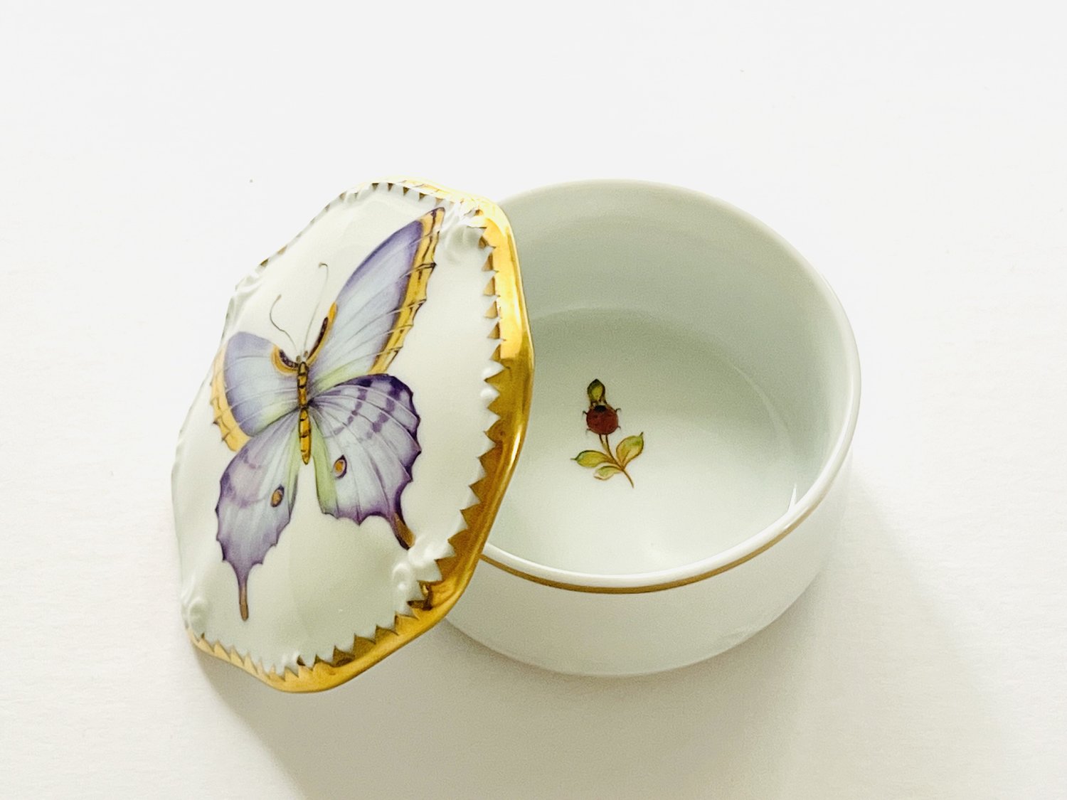 The Anna Weatherley Small Box with Purple Butterfly is a stunning example of fine craftsmanship and artistic elegance. This limited edition piece is carefully hand-painted in Anna Weatherley’s studio in Budapest, where every detail is brought to life with meticulous brushstrokes and a deep passion for design. The delicate purple butterfly, a symbol of transformation and beauty, rests gracefully against a pristine porcelain canvas, framed by a luxurious gold border that adds a timeless touch of sophistication.