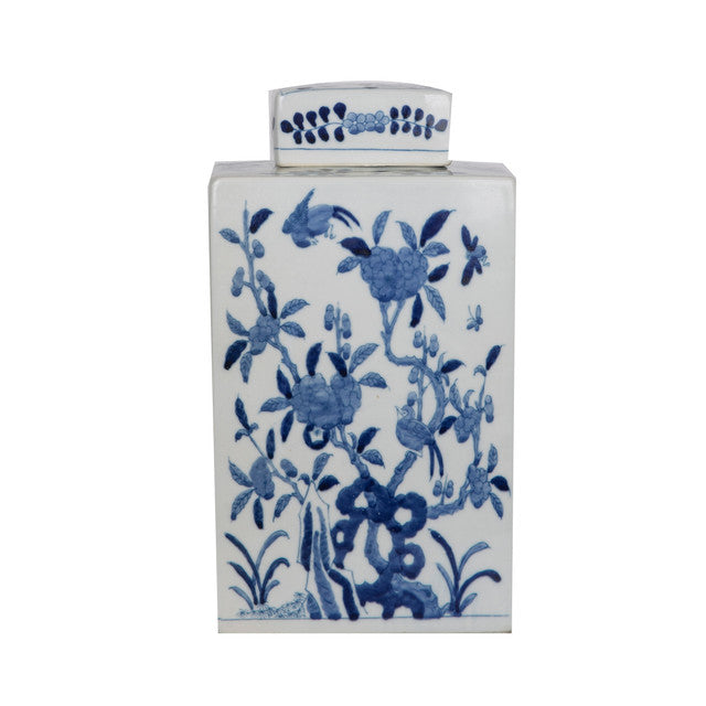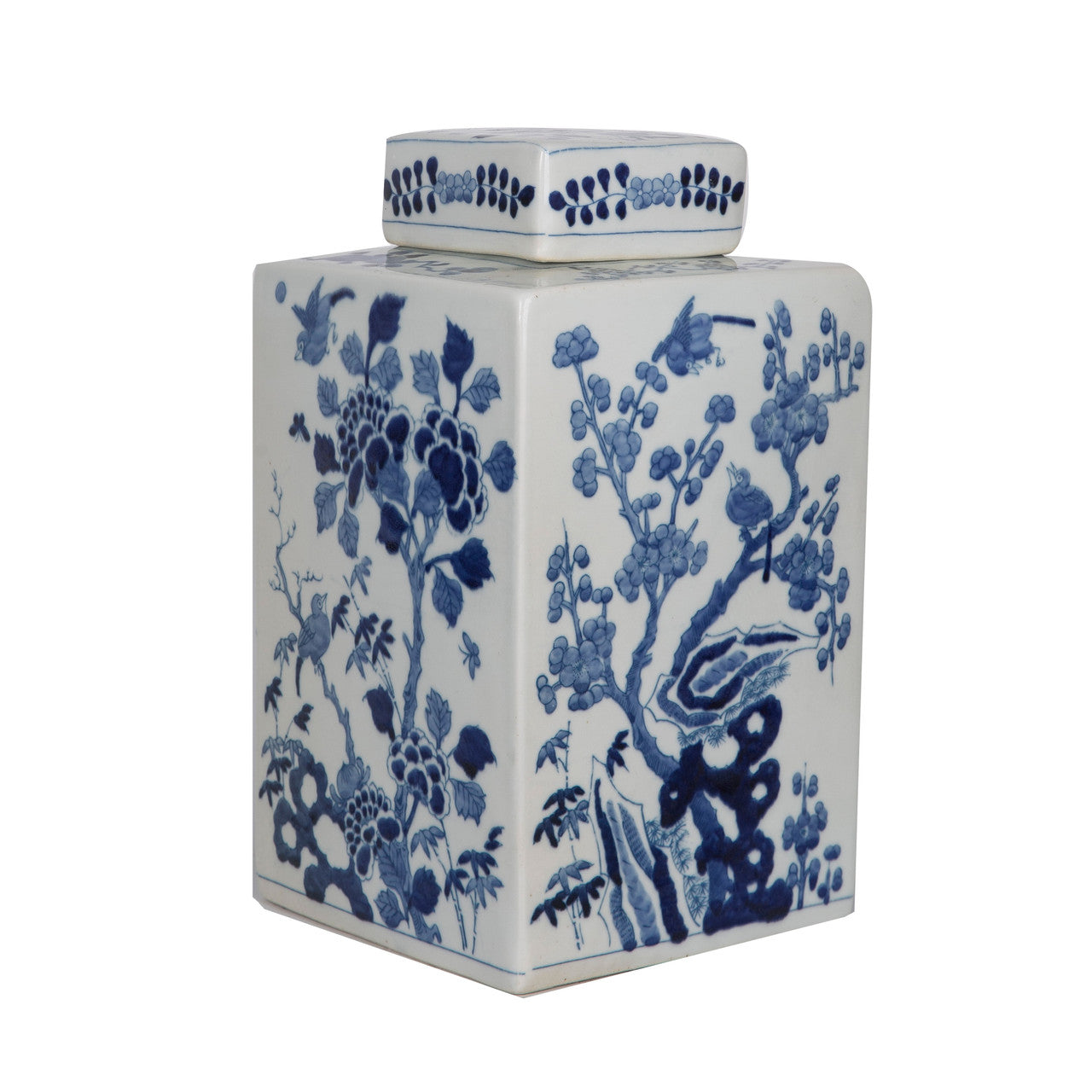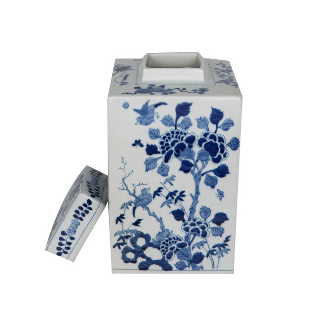 - Blue and White Square Tea Jar - Bird and Floral Motif