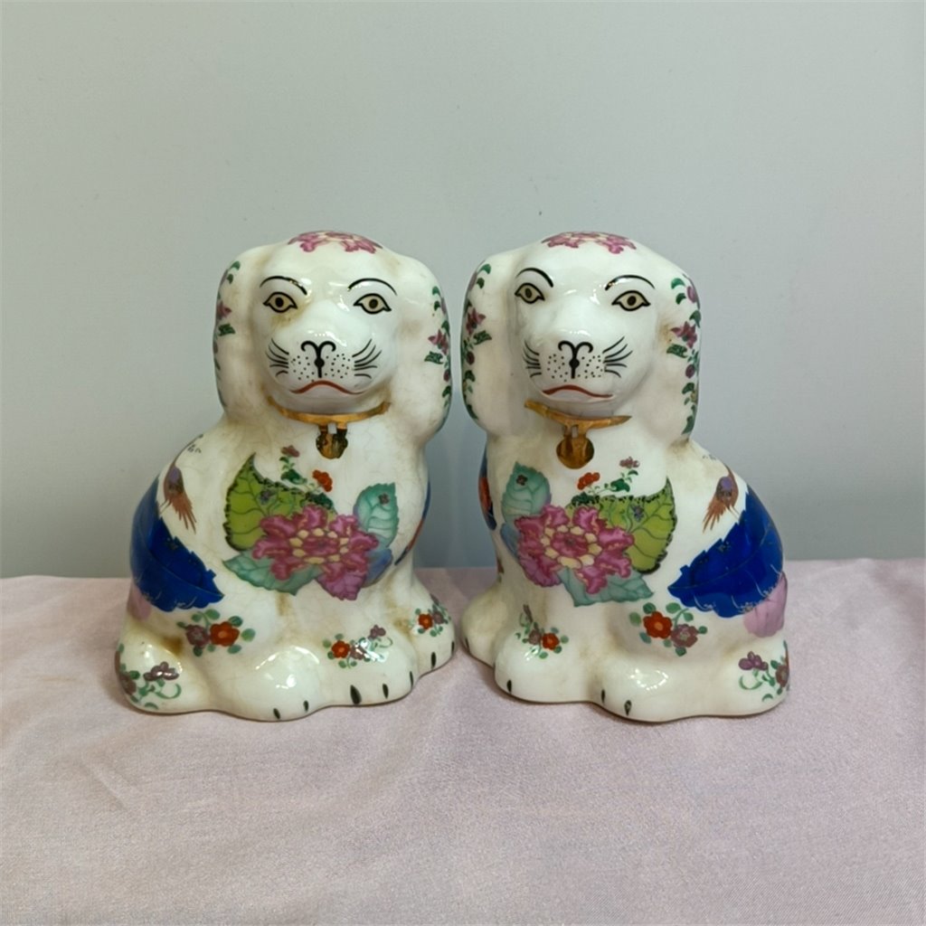 Danny's Exclusive design! This enchanting pair of petite Staffordshire dog figurines, standing approximately 3.5 inches tall, showcases the timeless elegance of the Tobacco Leaf pattern. These porcelain spaniel dogs are intricately hand-painted with vibrant colors and delicate details, making them a captivating accent for any space.
