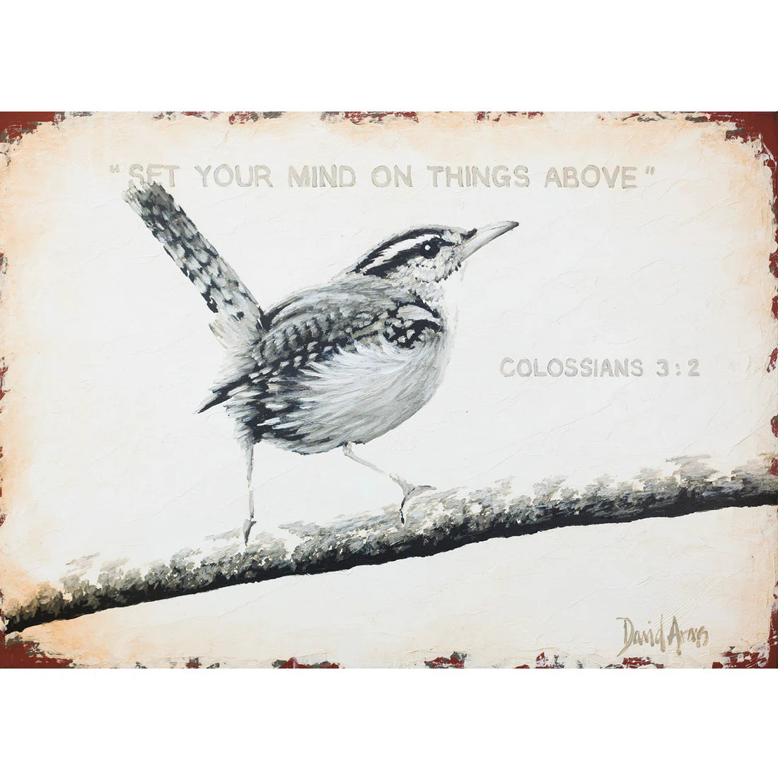 Featuring captivating artwork by David Arms, renowned for his soul-stirring creations, the Set Your Mind Card measures 5" x 7", making it a striking addition to any space. The front message encapsulates the essence of spiritual mindfulness, urging us to fix our thoughts on heavenly realms amidst life's distractions and challenges.