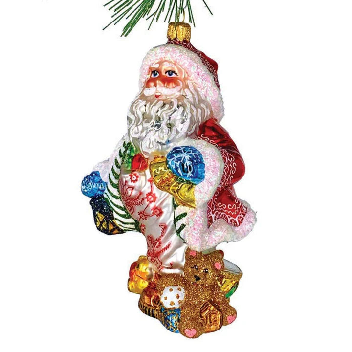 Holding a lantern and golden bells, he stands surrounded by glittering and exquisitely painted toys. Experience the opulence and attention to detail in Santa's attire, from his intricate jacket designs to his lantern and toy-filled feet. Truly an exclusive masterpiece, this European Glass Toy Master Ornament brings the spirit of Christmas to life.