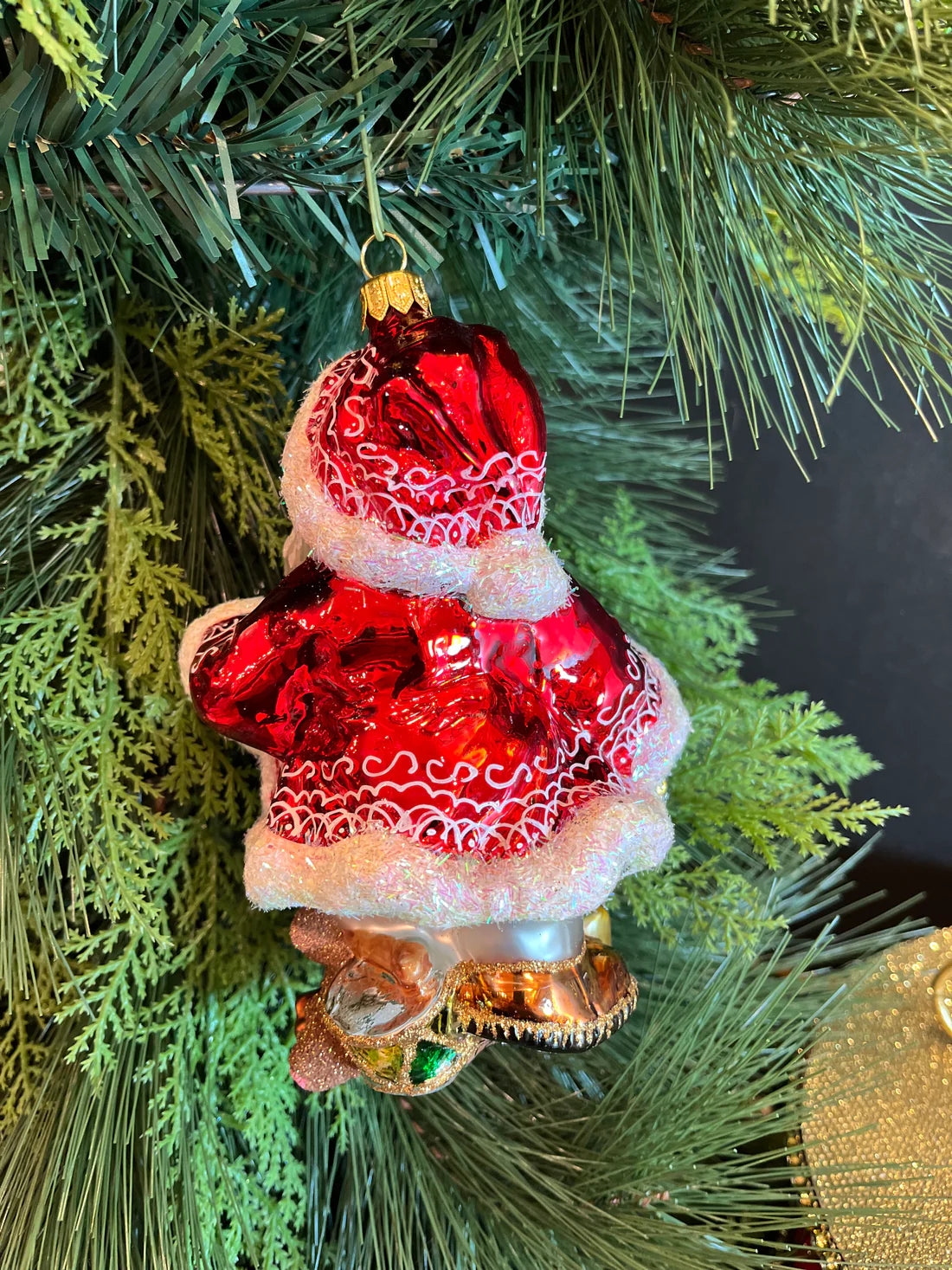 Discover the magic of the holiday season with our meticulously crafted European Glass Toy Master Ornament, a premium collectible that transforms your tree into a gallery of artistry. This exquisite piece captures Santa on Christmas Eve in an enchanting moment—gathering forgotten toys and ornaments while dressed in luxurious Nordic-inspired sleepwear that evokes timeless holiday tradition. His signature red jacket features hand-painted scroll designs of remarkable detail, complemented by sparkling eyelash trim that catches light beautifully from every angle.