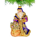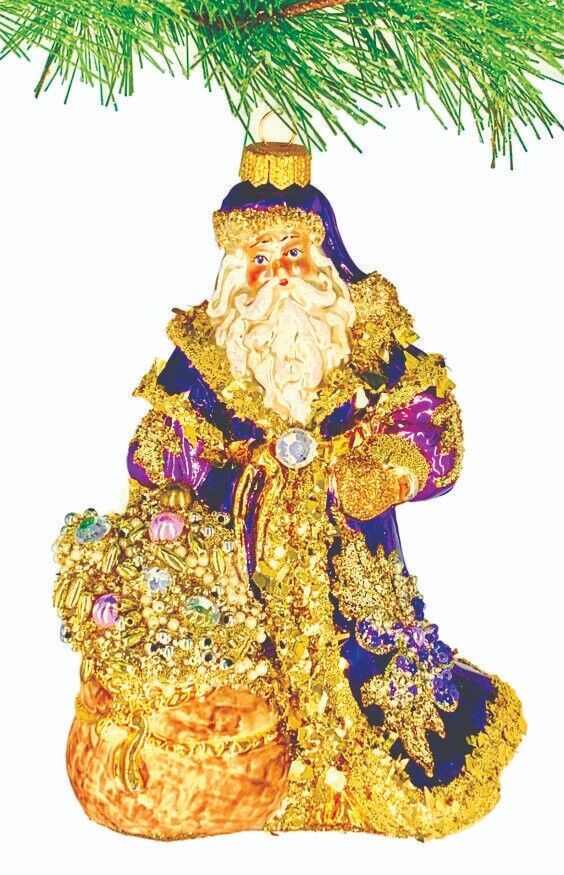 Indulge in the opulence of the limited edition WEXFORD CAROL ORNAMENT, a rare gem that will elevate your holiday décor to new heights of elegance. This exclusive European Glass design showcases Santa adorned in a lavish purple robe, cradling a bag overflowing with gold and jewels—a striking departure from traditional holiday imagery. Each ornament represents seven days of meticulous hand-crafted artistry, with every detail carefully rendered to capture the richness and grandeur of this iconic carol's imagery.