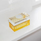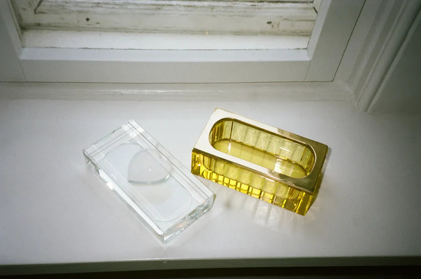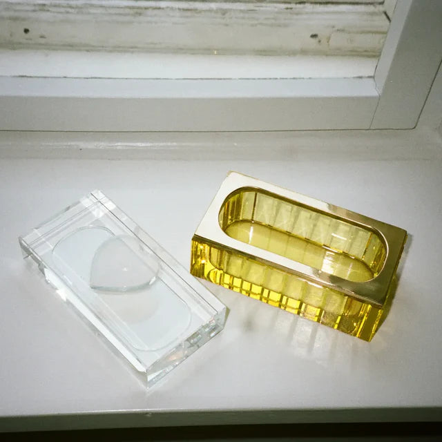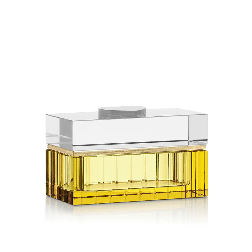 Handcrafted from lead-free crystal, this heart-shaped box features a striking color composition of white, clear, yellow, and brass tones. The geometric lines and Art Deco influences lend a bold yet graceful presence, creating a timeless accent that blends function with luxury.