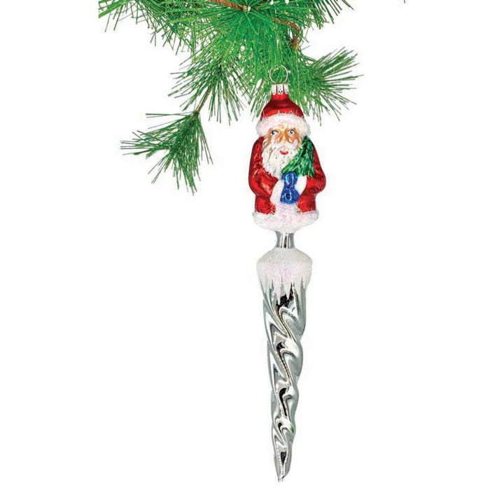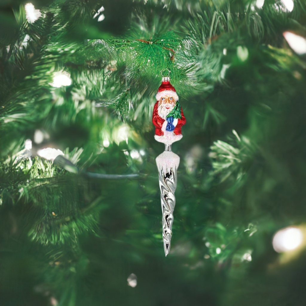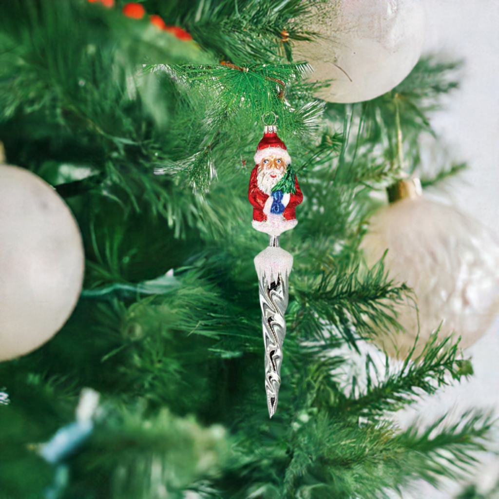 Durable and long-lasting, it features a hand-painted Santa atop a silver spiral icicle with both a superfine and confetti glitter for a special sparkle. This one-of-a-kind winter ornament is uniquely designed to stand the test of time, with its hand-crafted glass and sturdy construction. The perfect combination of traditional design and modern style, the metal spiral icicle and hand-painted Santa bring a gorgeous glow to your home's holiday décor.