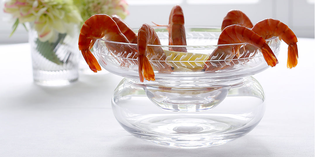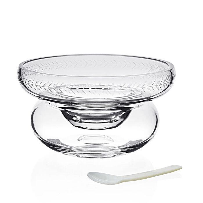 Ada Caviar Food Server This is the latest in our Collection of Caviar and Seafood Servers. It’s a beautiful piece in it’s simplicity with a stylish garland of leaves engraved around the top. It looks fantastic piled high with caviar in the center bowl or with Jumbo Shrimp lined around the outer rim with cocktail sauce in the middle.