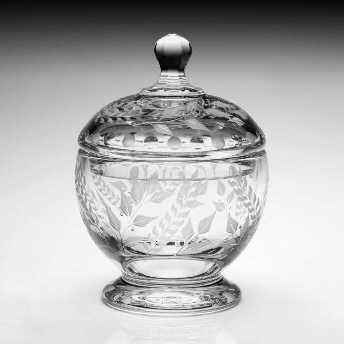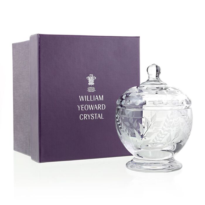Fern Bonbonniere Our latest addition to the Fern Collection is the beautiful Fern Bonbonniere. This piece is entirely blown and engraved by hand by skilled craftsmen who have trained for years to be able to produce this fine work. It is a versatile piece that could be used on a dining table, a side table or dressing table singly or in pairs. The bonbonniere would be a treasured gift for someone special or for yourself! Elevate your home décor with the exquisite Fern Bonbonniere. Meticulously crafted by master artisans, this stunning piece adds a touch of sophistication to any room. Whether placed on a dining table, side table, or dressing table, the Fern Bonbonniere exudes luxury and grace. Its elegant design makes it a perfect gift for someone dear or a special treat for yourself.- Fern Bonbonniere