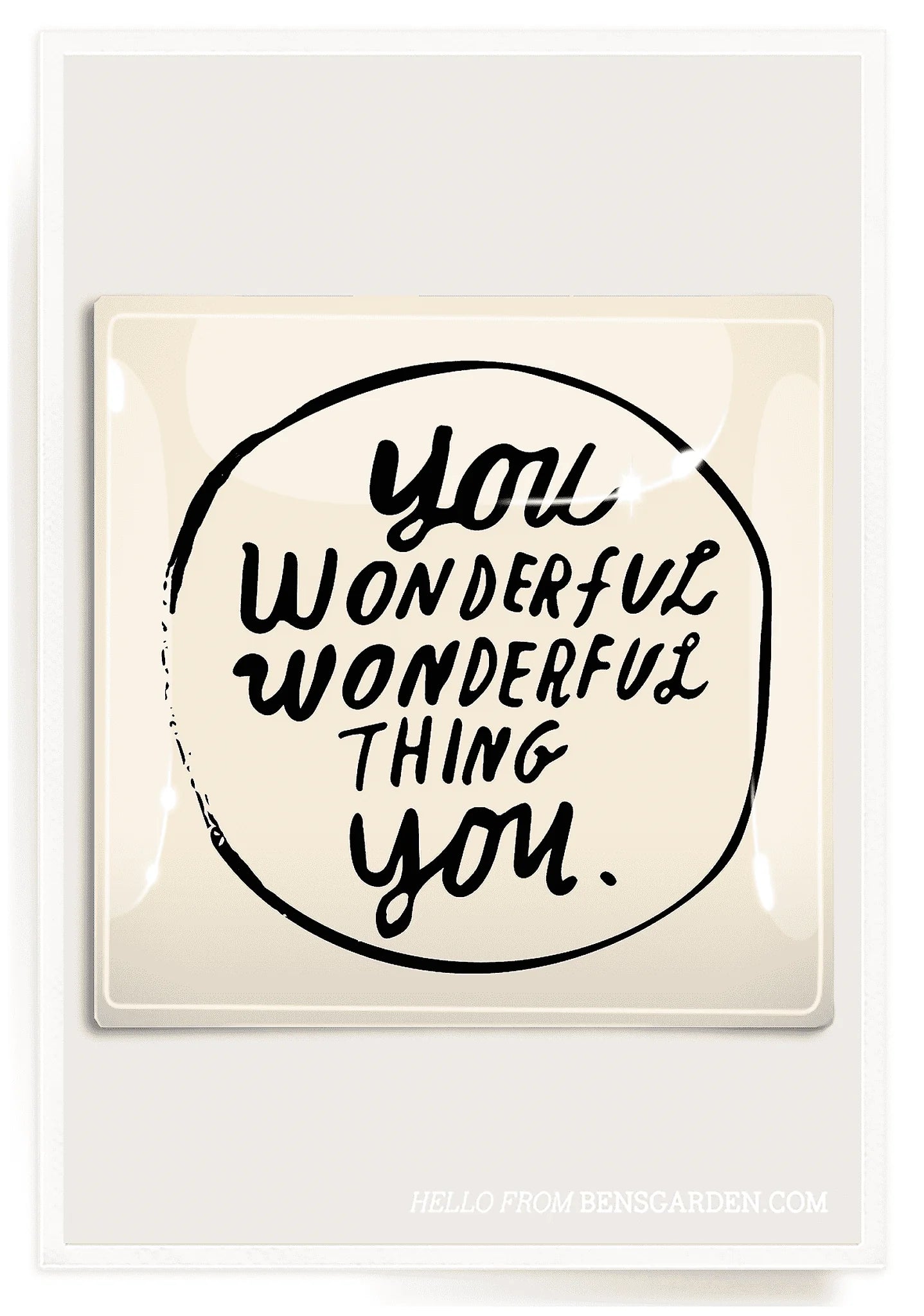 Celebrate someone special with the enchanting "You Wonderful Wonderful Thing You" Decoupage Glass Tray. Crafted in the French tradition of decoupage, this bent-glass tray is meticulously handcrafted in our New York Studio and showcases Ben's signature aesthetic, blending charm with a touch of whimsy. Individually signed by the artist, each tray is a unique piece of art.