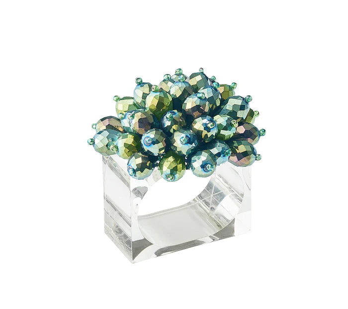 This stylish Zinnia Napkin Ring boasts olive and green beads, arranged in a subtle floral pattern, and is set on a clear acrylic square base. Perfect for elevating any formal dining setting, this napkin ring is a sophisticated addition to your table décor.